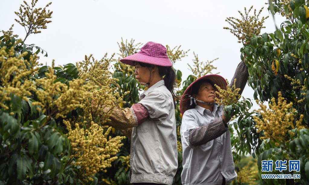4月5日,廣西欽州市久隆鎮青草村村民在進行果樹管理。