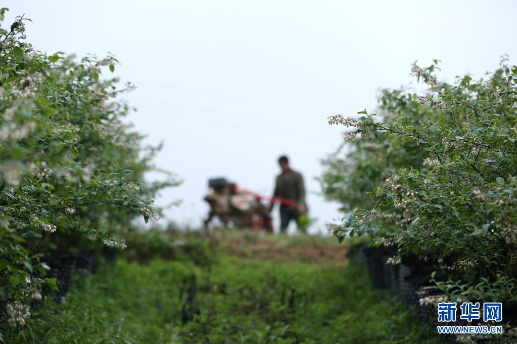 4月5日,村民在貴州省黔東南苗族侗族自治州丹寨縣興仁鎮甲腳村藍莓園內犁地。