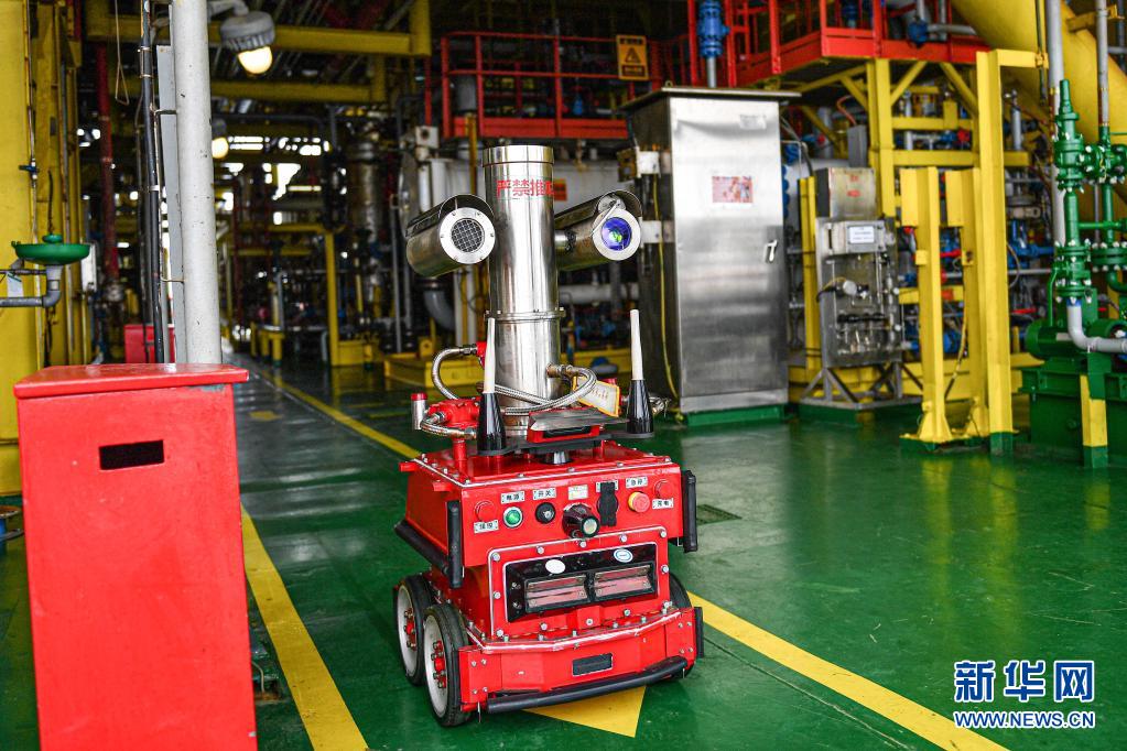 4月25日,巡檢機器人在中國海油樂東15-1氣田上進行巡檢作業。