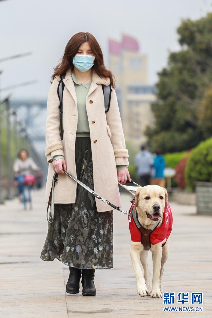 導盲犬“Bingo”陪伴李靜在南京長江邊的景觀帶散步(3月27日攝)。 新華社發 (張夢 攝)