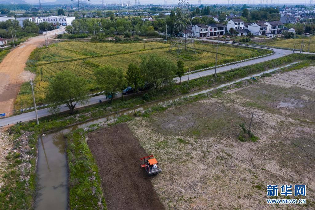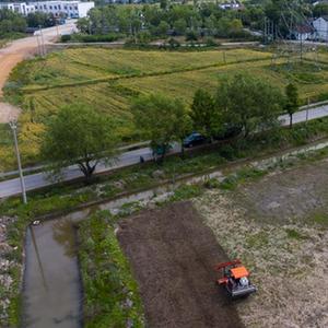 在東林鎮(zhèn)保永村,種植戶操作旋耕機耕地,準(zhǔn)備播種水稻(5月7日攝,無人機照片)。