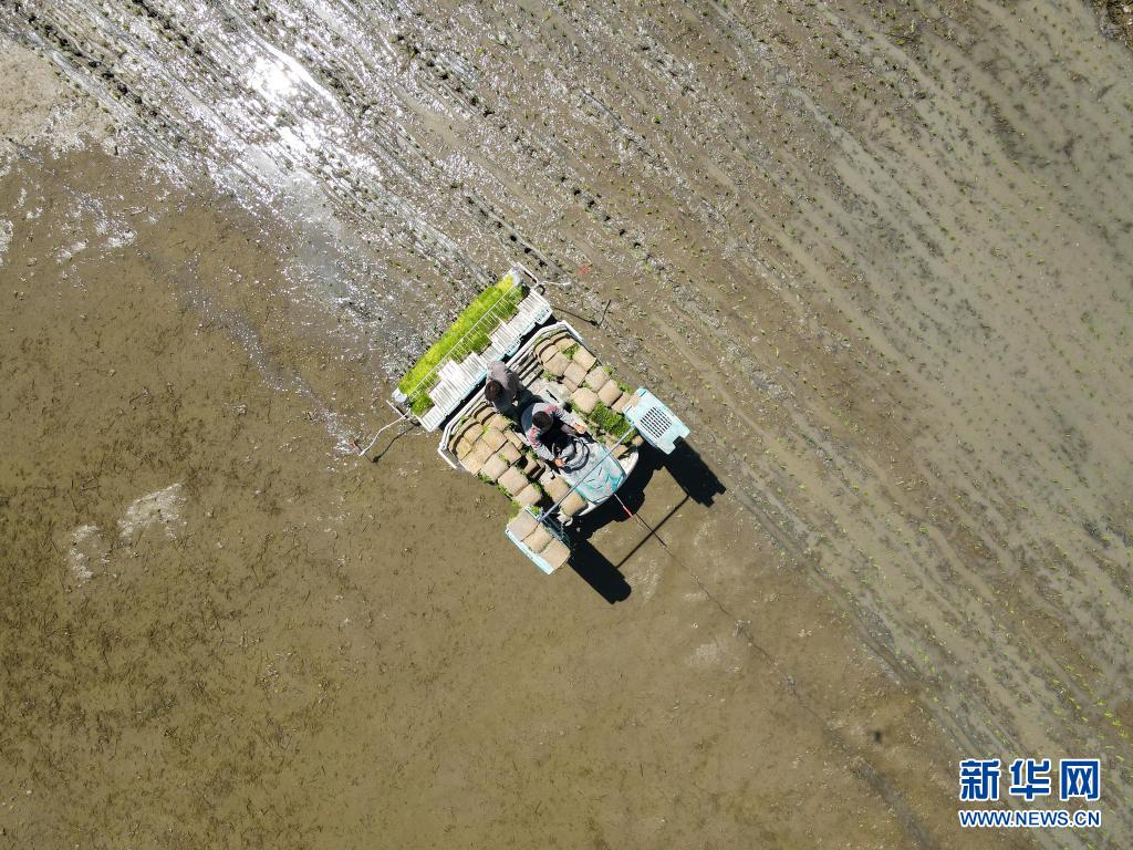 5月20日,新疆溫宿縣恰格拉克鄉的稻農駕駛插秧機進行水稻插秧(無人機照片)。