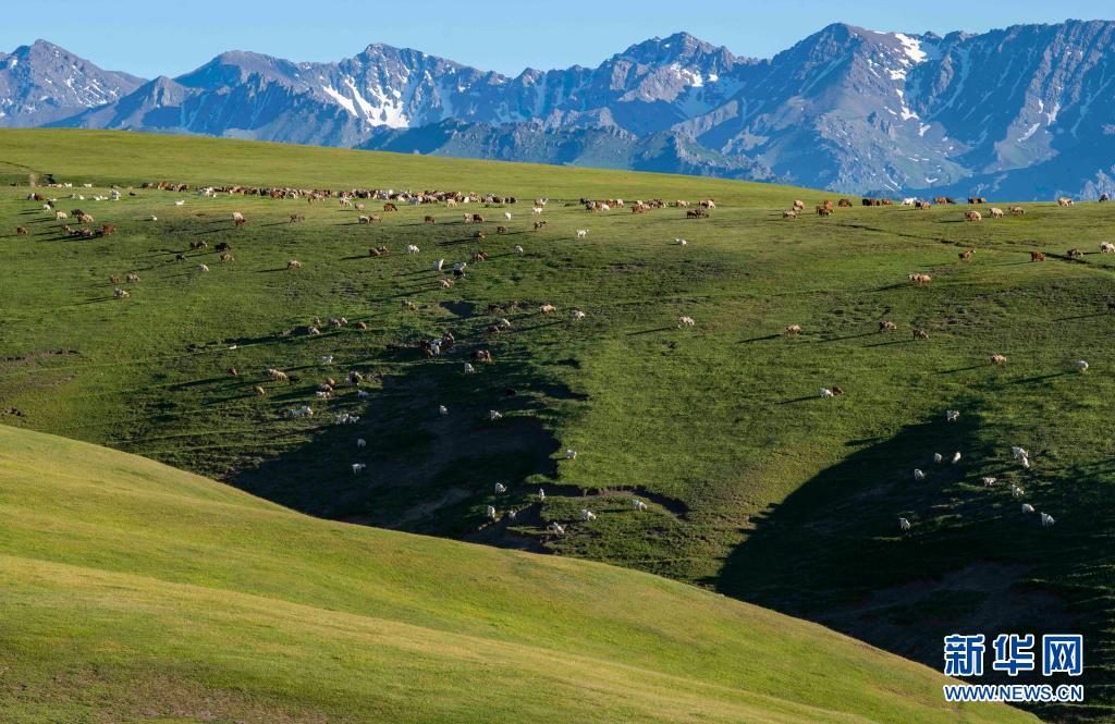 新疆裕民縣巴爾魯克山區夏牧場上的羊群(6月14日攝)。
