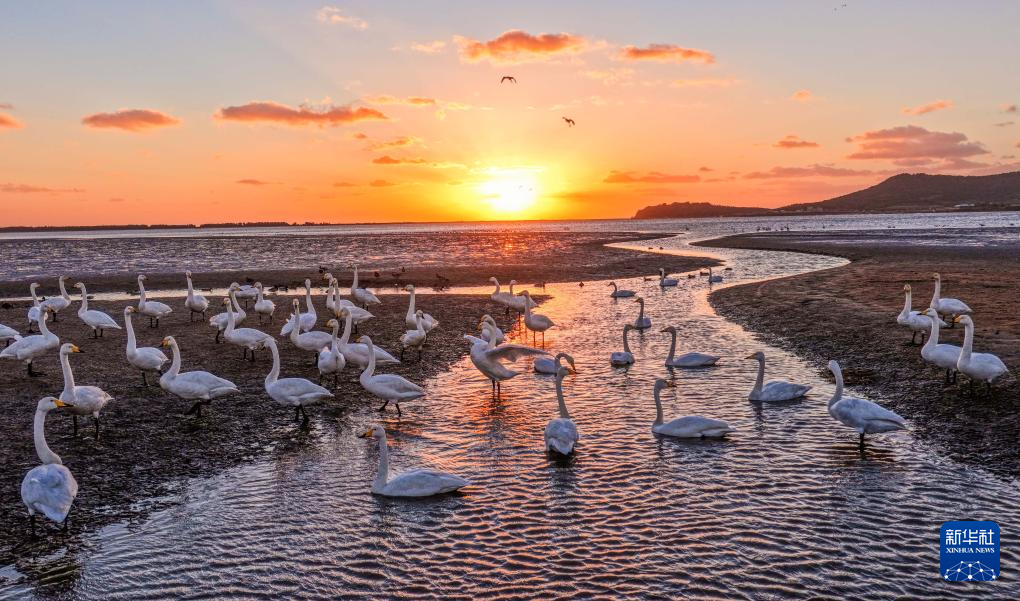 11月2日,在山东省荣成市成山镇天鹅湖湿地,大天鹅在栖息、觅食(无人机照片)。
