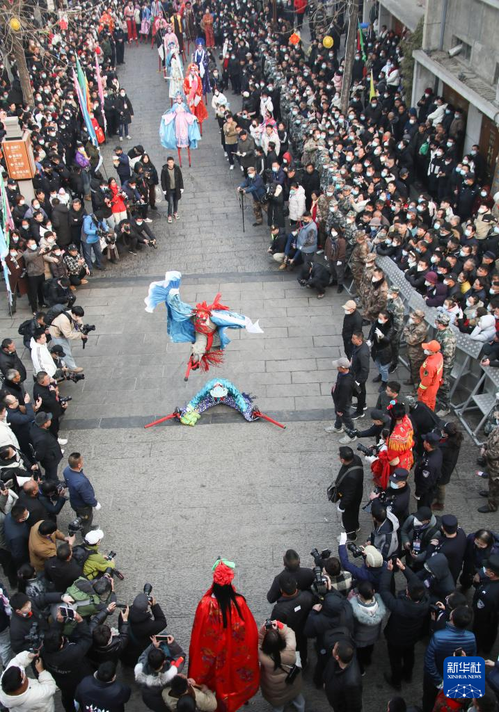 2月6日,社火团队的演员在庙会上表演(无人机照片)。