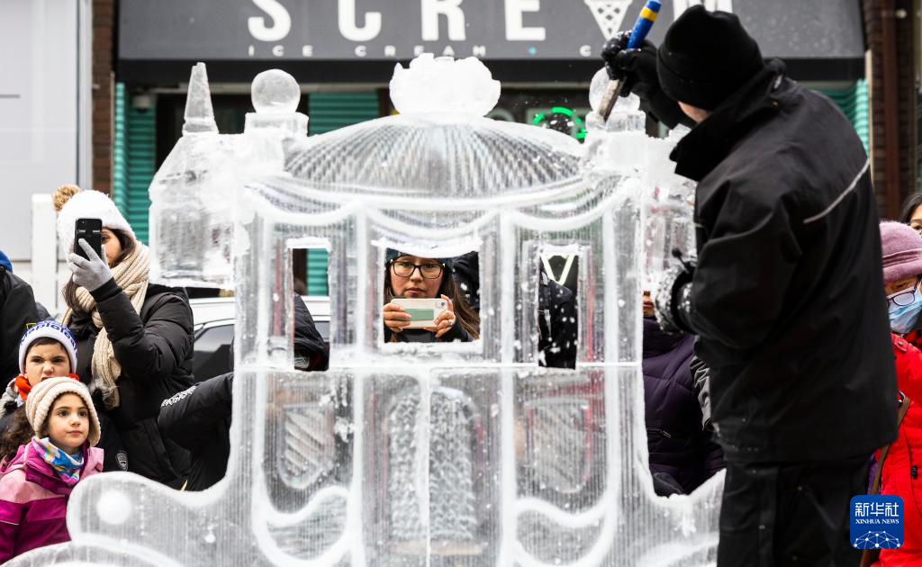 2月18日,冰雕师在加拿大多伦多街头制作冰雕。
