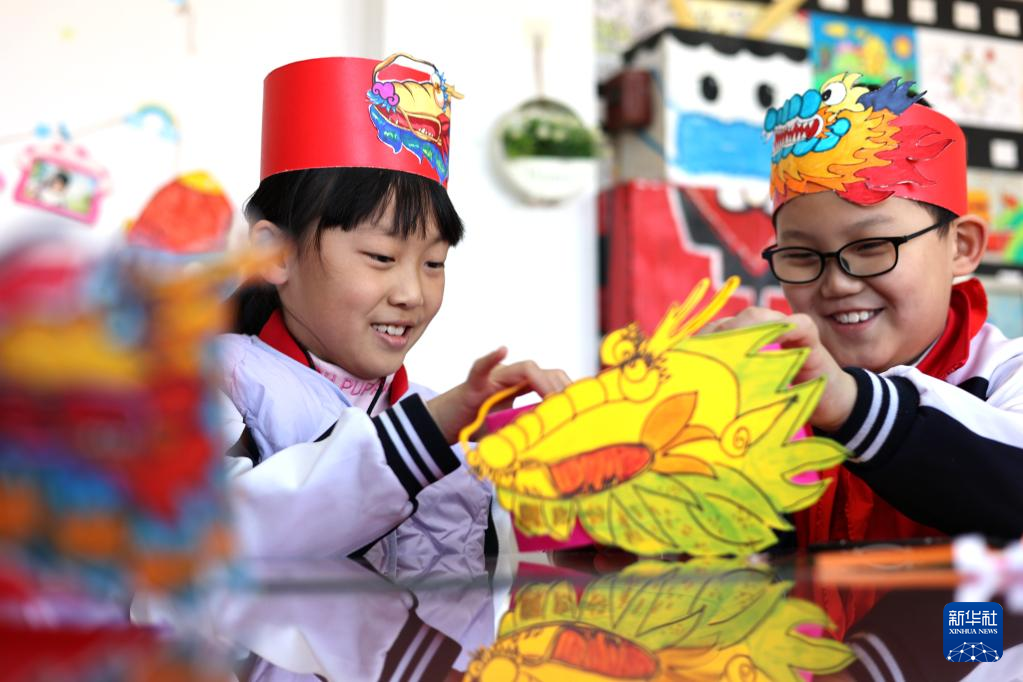 2月20日,山东省滨州市渤海中学南校区的小学生制作“龙抬头”主题的头饰手工作品。