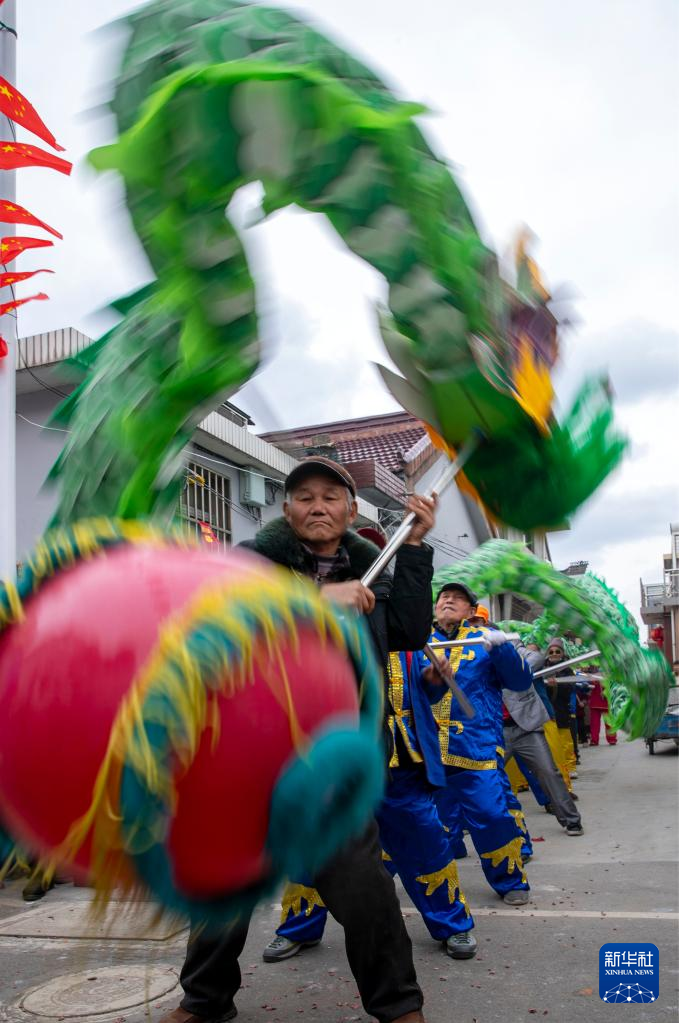 2月21日,在安徽省合肥市肥东县合肥循环经济示范园泰和社区,人们在表演舞龙。