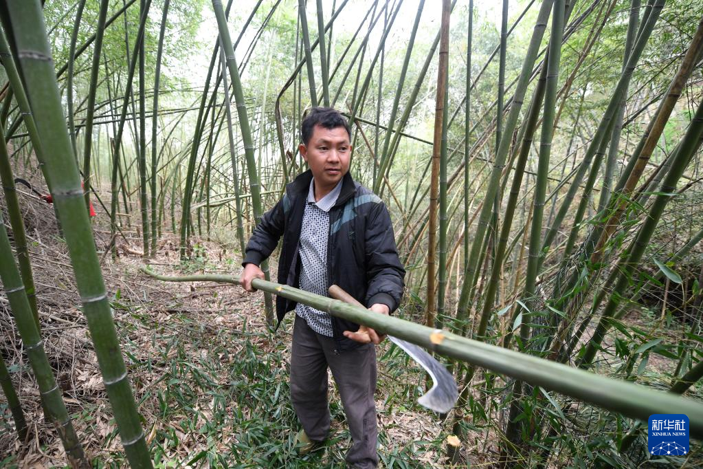3月15日,在广西金秀瑶族自治县忠良乡巴勒村,村民砍伐竹子准备编织竹编产品。
