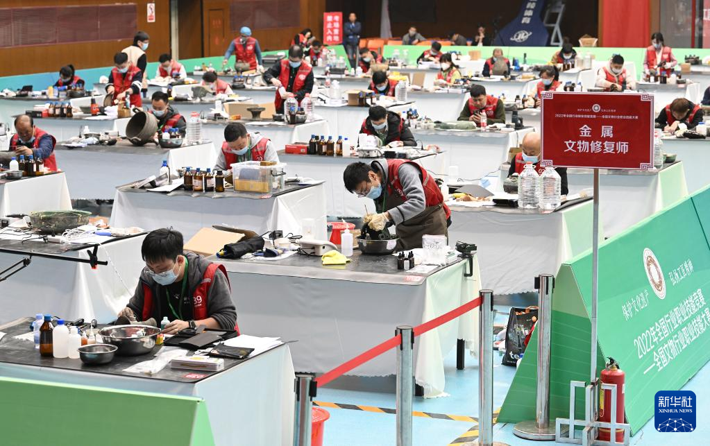 3月25日,参加金属文物修复师比赛项目的选手在现场修复文物。