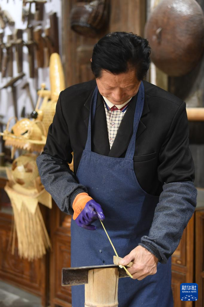 4月3日,篾匠徐明光在姜鹏的工作室削篾条。作为村里有名的老篾匠,他在这里找到了这门手艺的新方向。