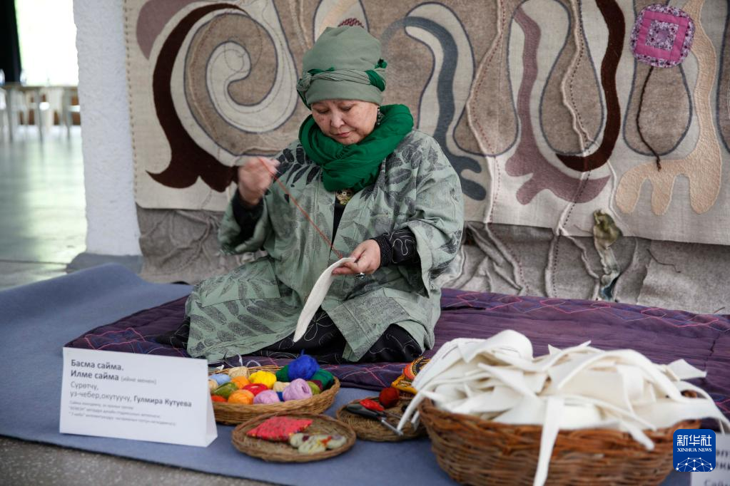 4月15日,在吉尔吉斯斯坦首都比什凯克,一名手工艺人在刺绣艺术节上制作产品。