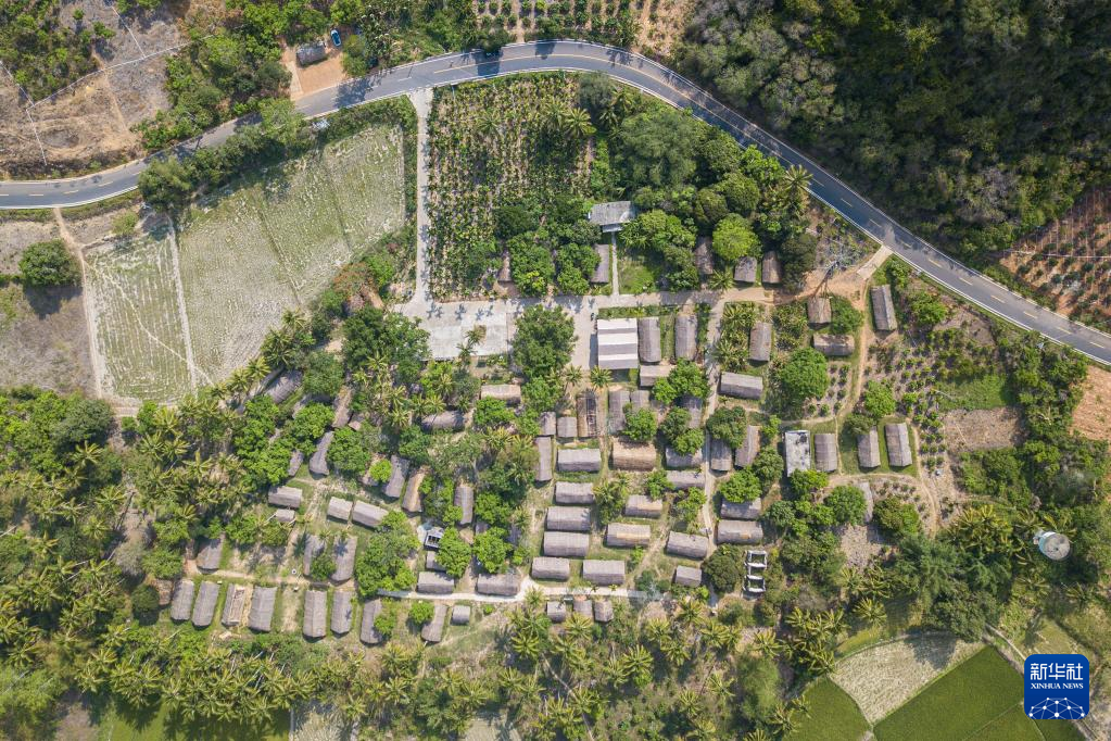 4月28日在海南省东方市白查村拍摄的黎族船型屋及近年修建的道路(无人机照片)。