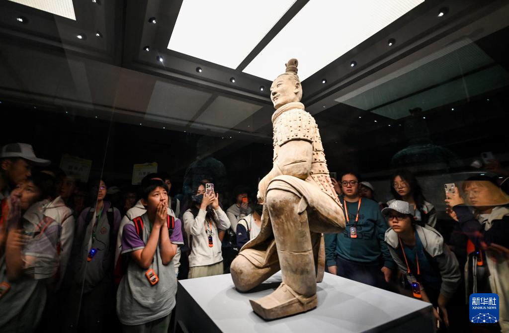 游客在秦兵马俑二号坑遗址参观跪射俑(4月26日摄)。