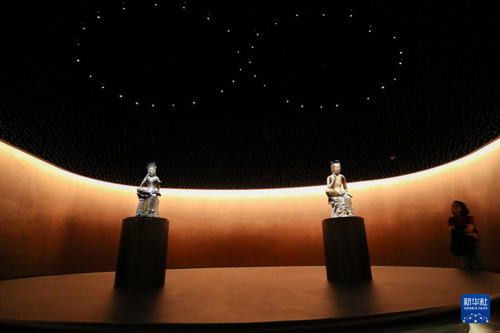 5月18日,在韩国首尔国立中央博物馆,游客在思惟展厅参观韩国国宝“半跏思惟像”。