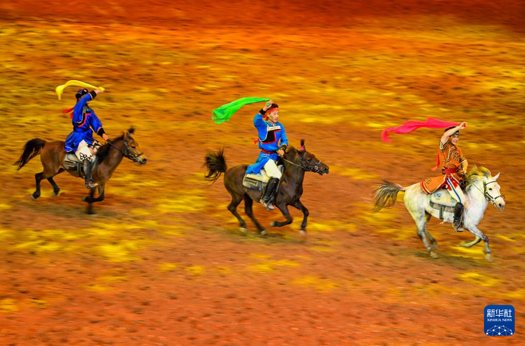 当日,由内蒙古民族艺术剧院出品的2023年大型马舞剧《千古马颂》在呼和浩特上演。该剧以马术表演为主,综合运用了舞蹈、器乐、杂技等艺术元素,融合了现代高科技舞台技术,以全新艺术形式生动演绎了人与马相遇、相识、相伴、不离不弃、生死与共的情感历程,体现了人、马与自然和谐共存的精神。