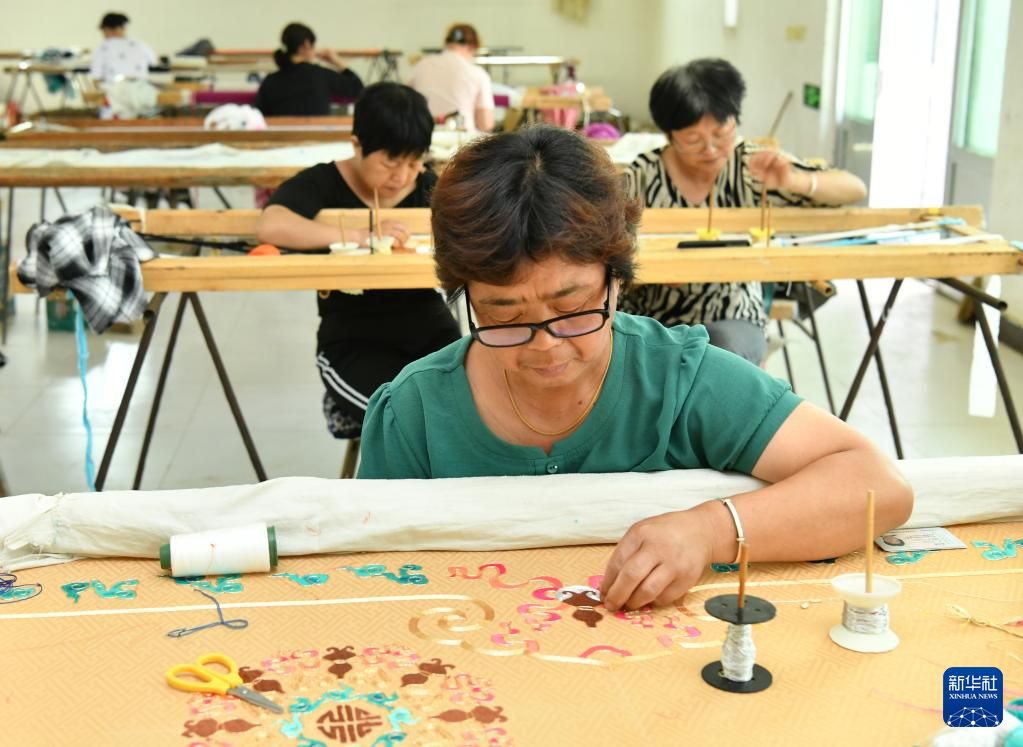 6月13日,河北省肃宁县邵庄乡东高家口村一家戏曲服装厂的工人在绣制戏曲服装。