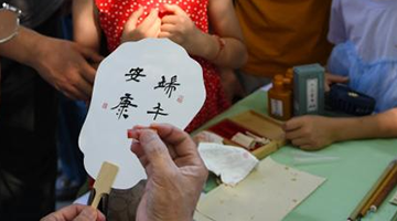 伍涛在客房检查满洲窗烛花玻璃折叠门的拼花木框工艺质量(6月26日摄)。
