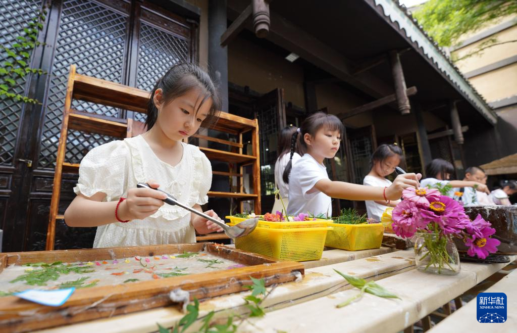 7月21日,小朋友在贵州省黔东南苗族侗族自治州丹寨县万达小镇体验“古法造纸”。