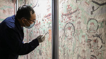 8月19日,在大足石刻宝顶山景区,工作人员对石刻造像病害进行处理。