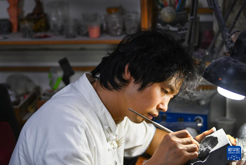 倪朋辉在工作室精心创作砖雕作品(8月25日摄)。