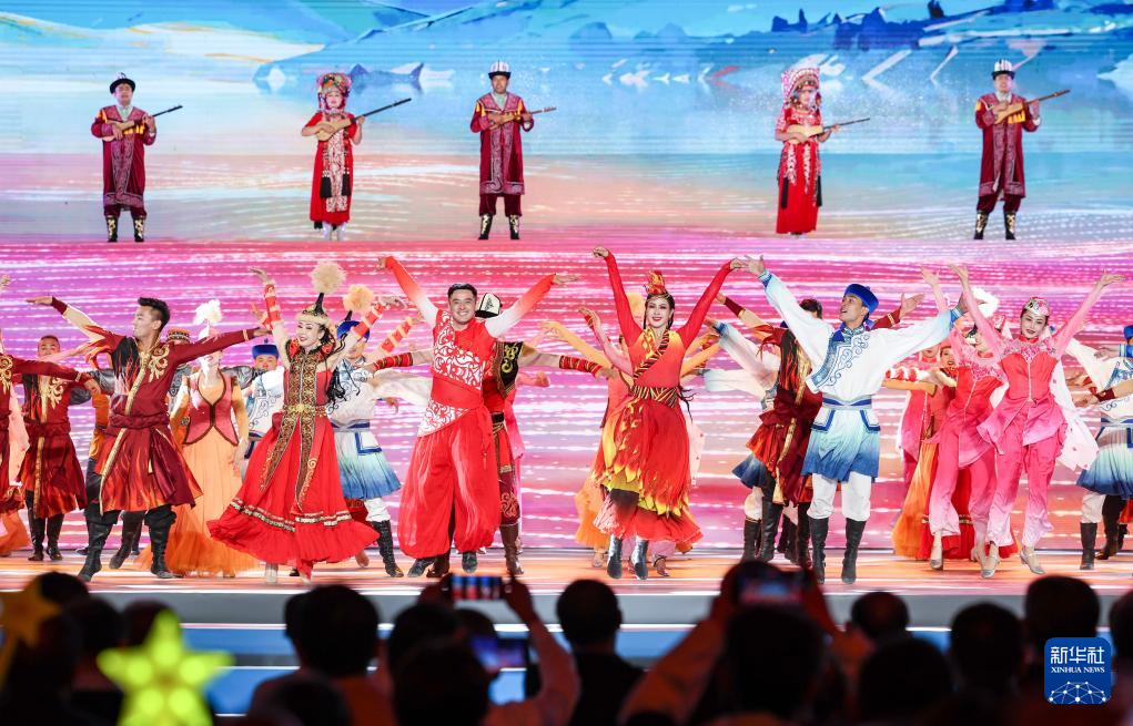 演员在表演各民族联舞《舞动天山》之群舞《中华民族一家亲》(9月12日摄)。