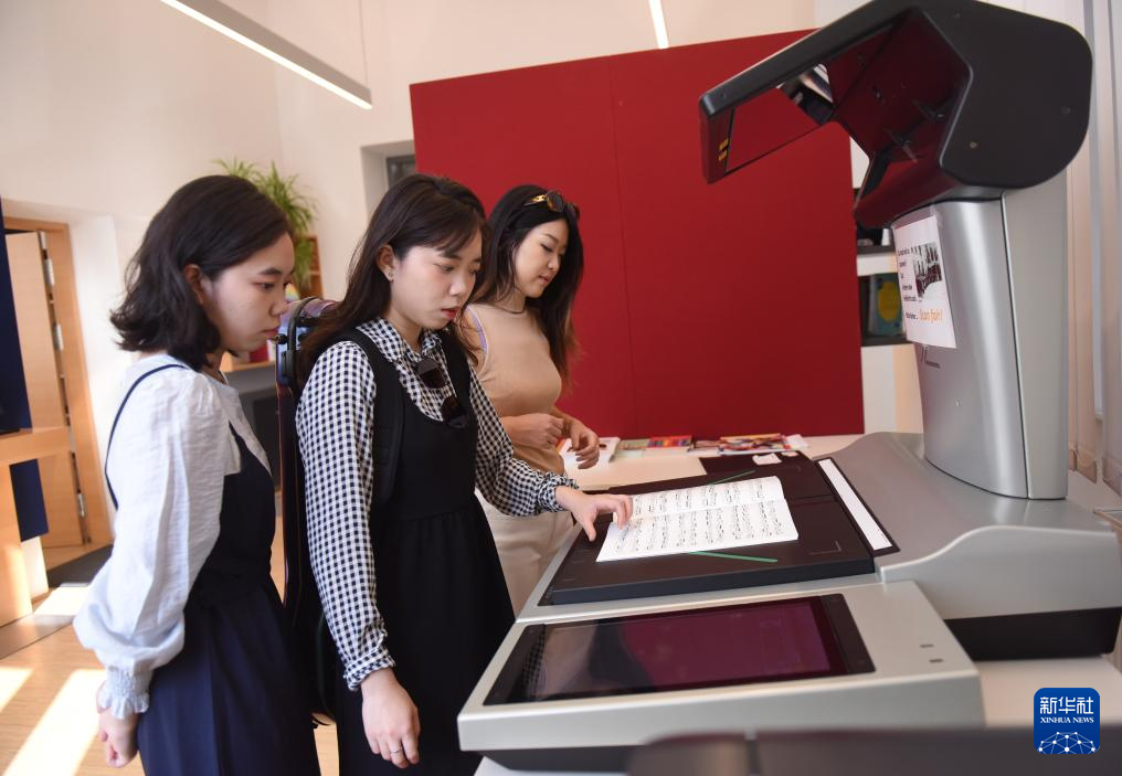 9月13日,中国留学生黄韵瑜(左)、黄韵文(中)、王嘉曦在维也纳国立音乐与表演艺术大学图书馆扫描乐谱。
