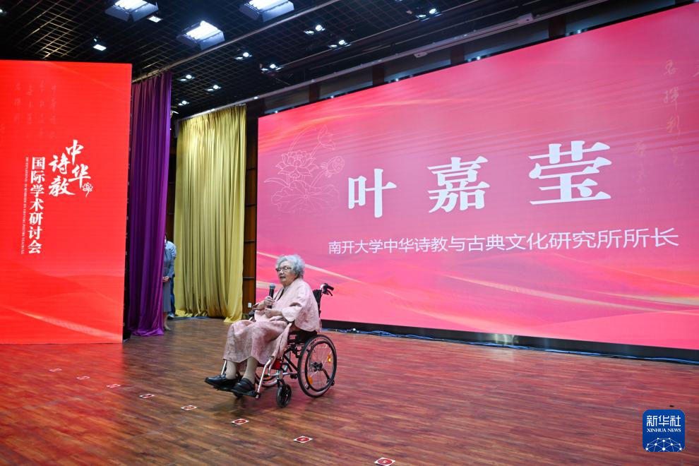 当日,中华诗教国际学术研讨会在天津南开大学开幕,来自中国、美国、加拿大、日本等国家和地区的近200位学者参会,共话中华诗教的传承与弘扬。研讨会现场,年近百岁高龄的叶嘉莹先生坐着轮椅登台,讲述自己的诗词人生与诗教情怀,并对年轻人送出鼓励寄语。