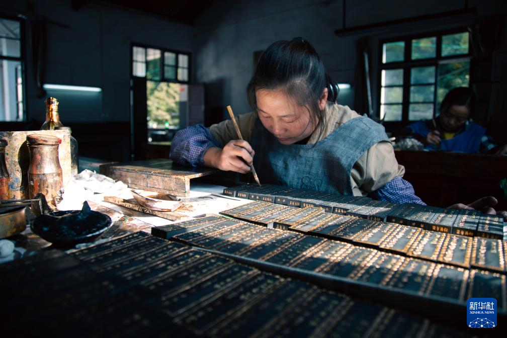 10月24日,在安徽省黄山市歙县老胡开文墨业有限公司,工人在描金车间为晾制好的墨描金。