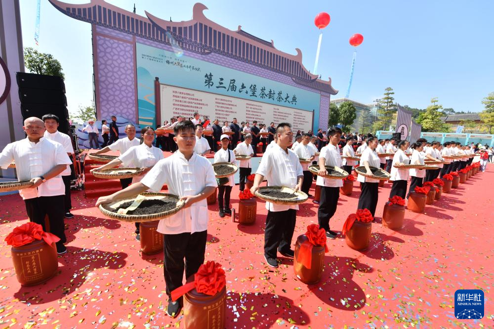 在梧州市苍梧县六堡镇六堡茶文化广场,当地制茶人参加封茶仪式(10月15日摄)。