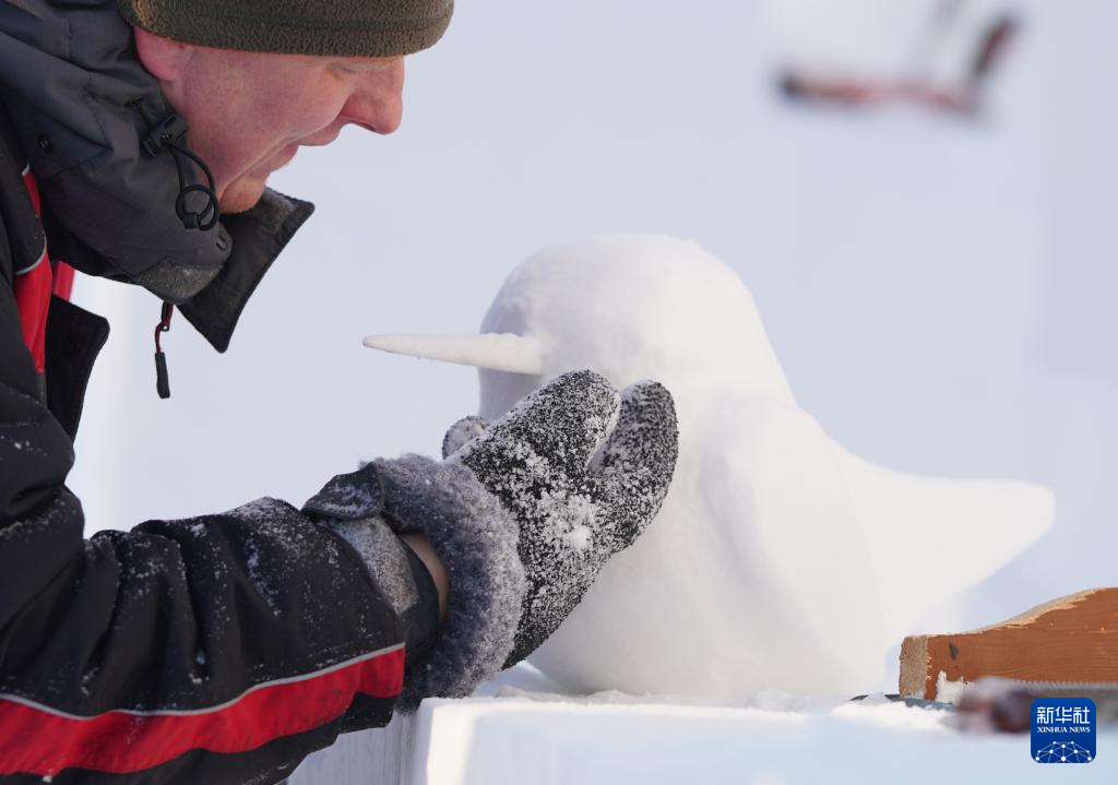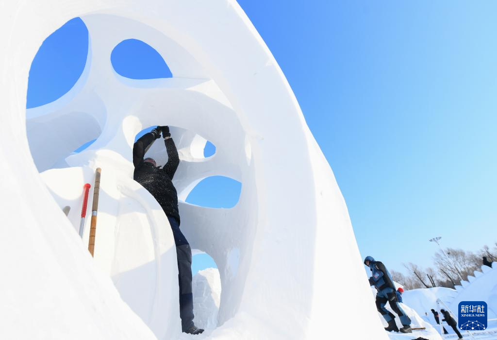 1月8日,选手在太阳岛雪博会园区内制作雪雕。