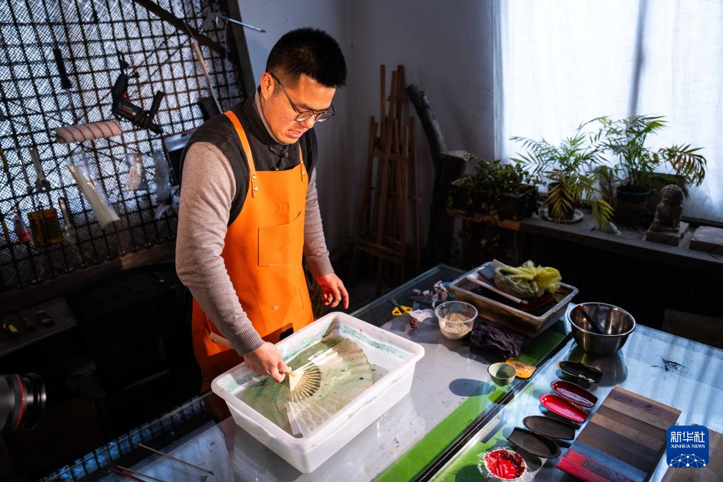 2月28日,郝冠雄在晾晒制作的漆扇。