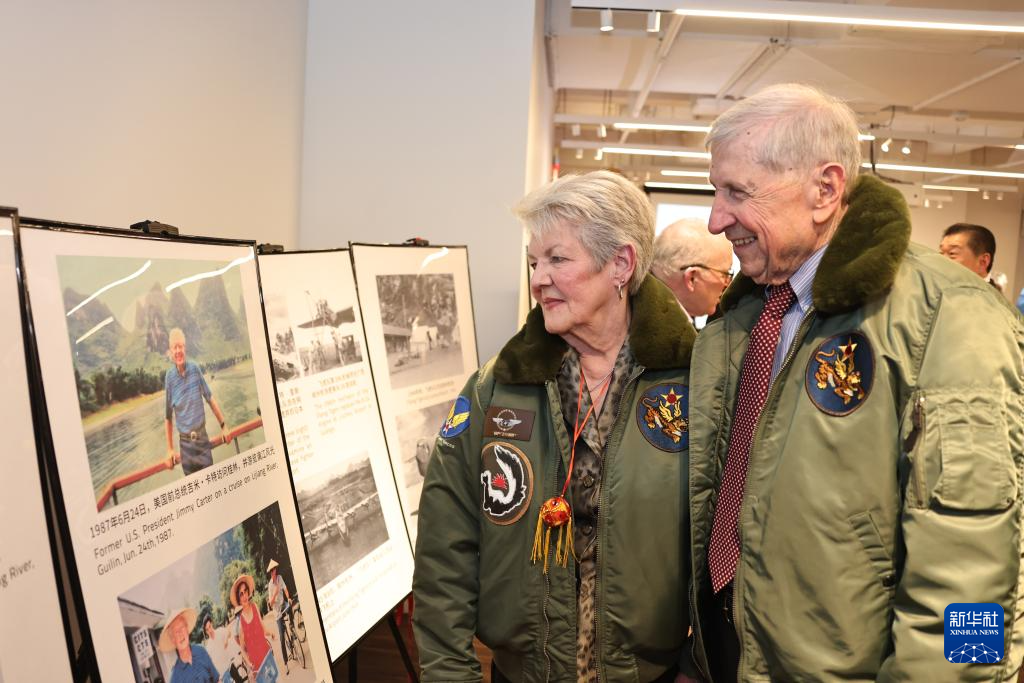 3月11日,美中航空遗产基金会副主席金坎农(左)及其丈夫身着飞虎队制服在美国纽约参观“中美友好在广西”图片展。