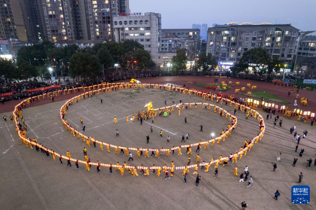 3月16日,板板龙灯队伍在慈利县人民广场进行舞龙表演(无人机照片)。