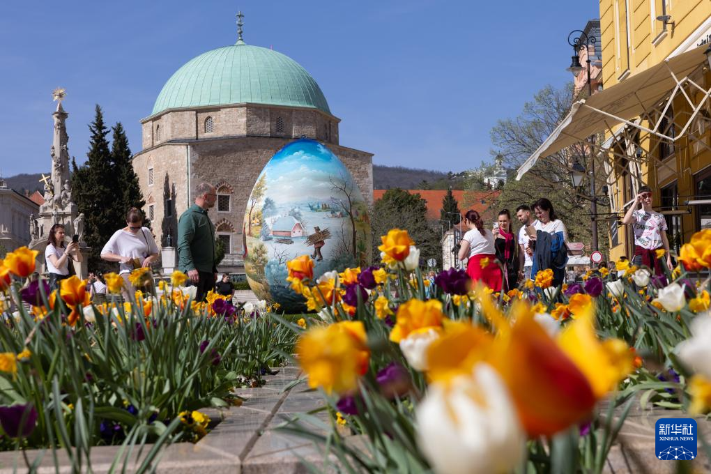 3月30日,人们在匈牙利南部城市佩奇街头参观复活节巨型彩蛋。新华社发(弗尔季·奥蒂洛摄)