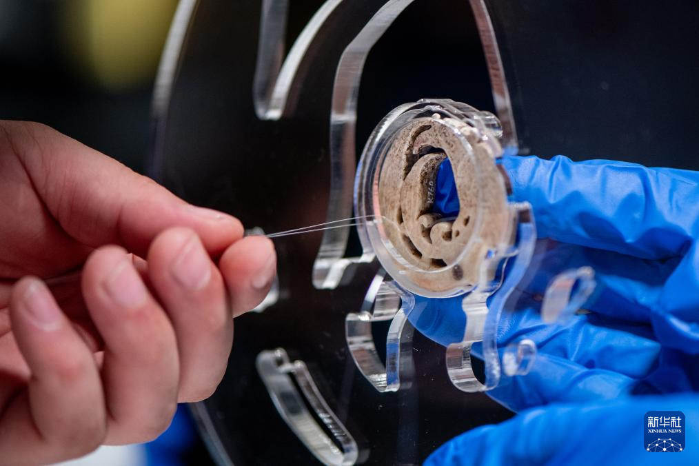 3月30日,工作人员在固定展品玉团凤。为迎接玉团凤,武汉盘龙城遗址博物院在玉团凤展柜上方将灯光布置成玉团凤形状。