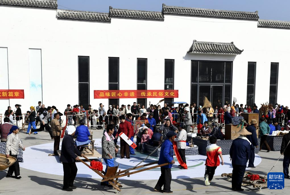 当日,在山东省滨州市阳信县水落坡镇举行的第十四届黄河三角洲民俗文化节上,当地乡村社火队展示传统生产、生活技艺,“老把式”登上文化舞台,还原鲁北乡村传统民俗风情。