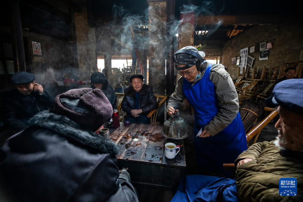 在成都市双流区彭镇观音阁老茶馆,老板李强(右二)为茶客们添水(2021年11月23日摄)。