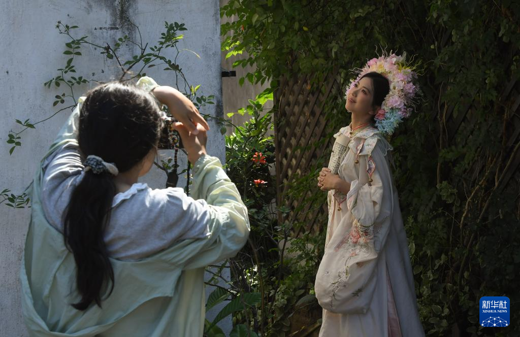 6月12日,在杭州大兜路历史文化街区的一家素食餐厅,客人拍摄庭院风景。