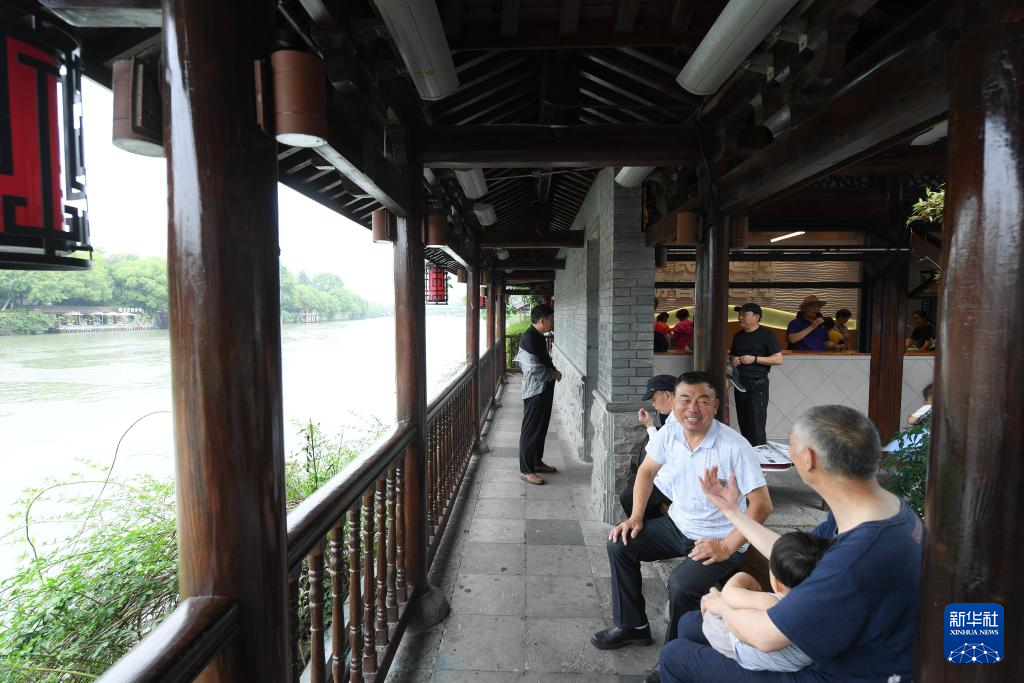 6月12日,人们在大运河畔的游廊里休憩。