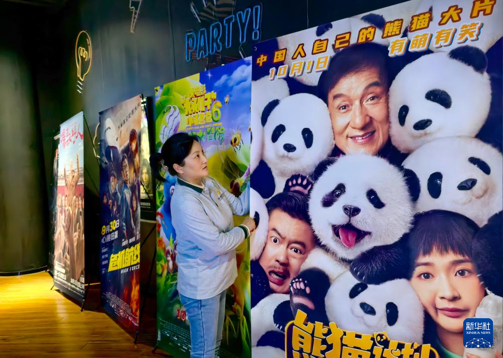 10月7日,工作人员在江苏省南通市一家影院整理电影海报。
