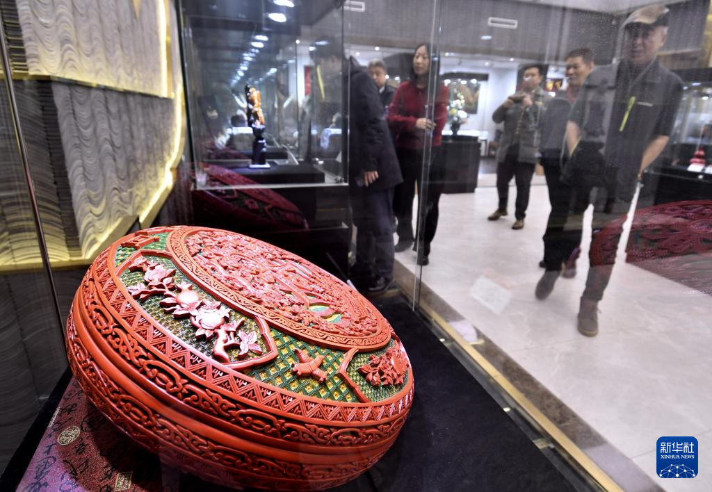 观众在参观雕漆大师朱江的套色雕漆作品(12月19日摄)。
