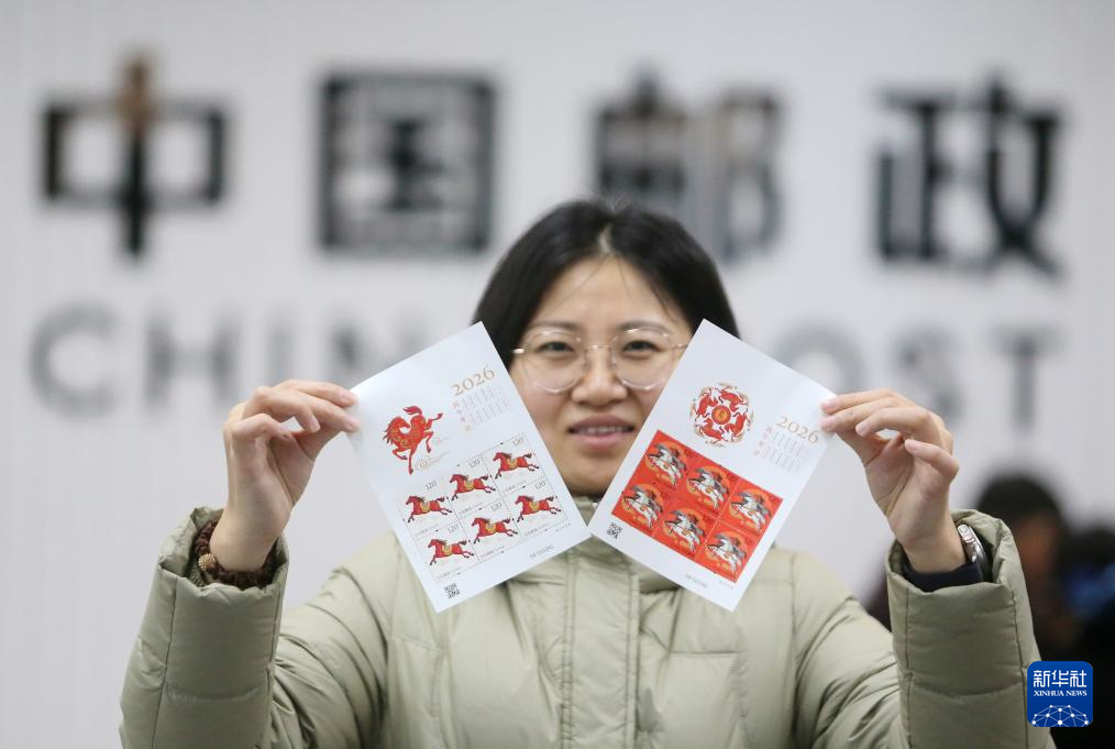 1月5日,在江苏苏州吴文化博物馆邮票发行站,一名集邮爱好者展示刚购买的《丙午年》特种邮票。