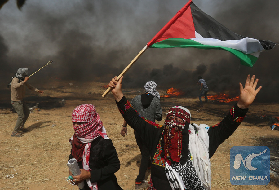 GAZA, April 13 (Xinhua) -- In a rare scene, Palestinian women were on front lines during Friday confrontations with Israeli soldiers along the Gaza-Israel borders.