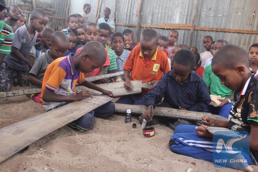 Somali children write Koran during a religious class in Mogadishu, capital of Somalia, Feb. 7, 2018. (Xinhua/Faisal Isse)
