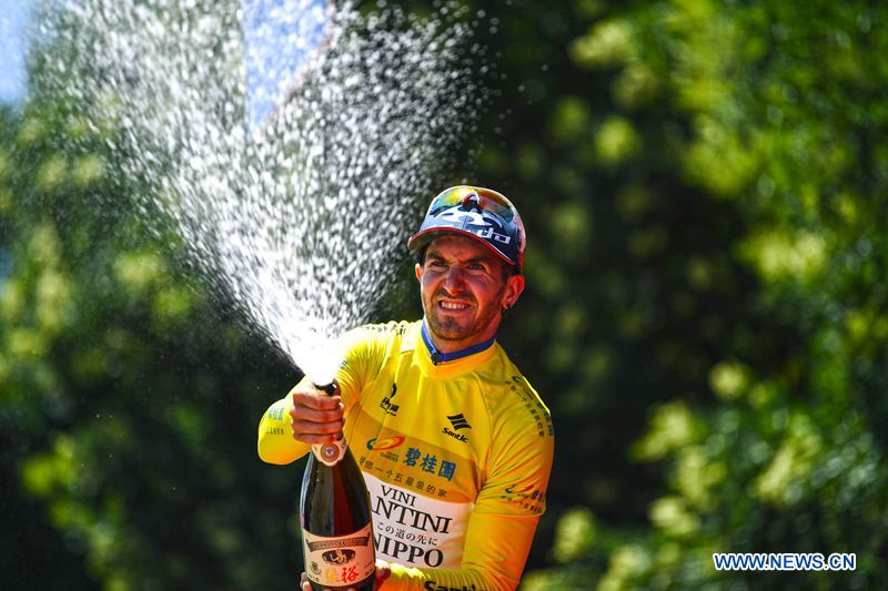 Eduard Michael Grosu from Italian Nippo-Vini Fantini Team (NIP) celebrates with the yellow jersey at the award ceremony of the third stage of the Tour of Qinghai Lake in northwest China's Qinghai Province, on July 24, 2018. (Xinhuanet Photo by Yang Shoude)