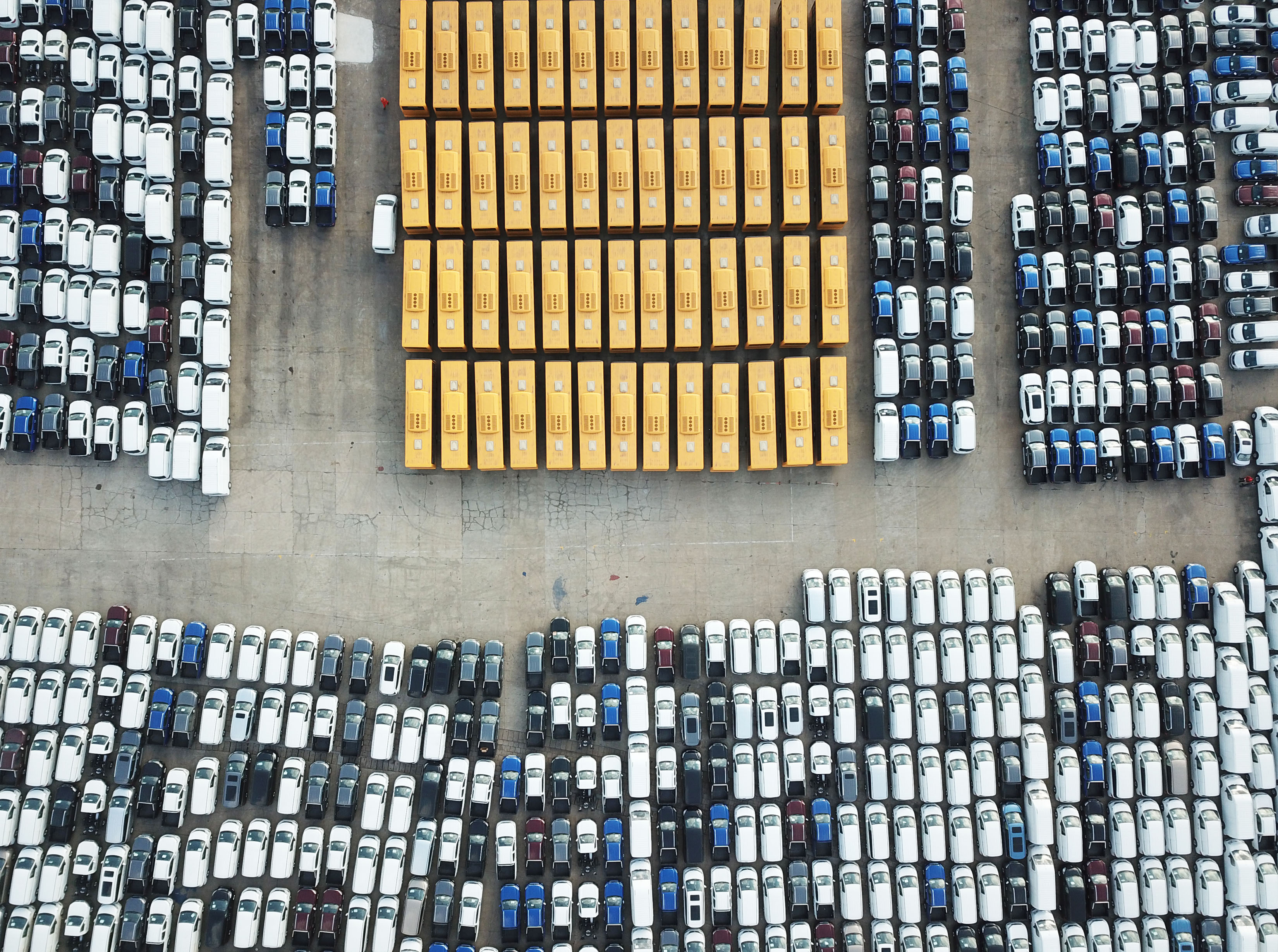 Aerial photo taken on Dec. 31, 2018 shows homemade vehicles at a port in Lianyungang, east China's Jiangsu Province. (Xinhua/Geng Yuhe)