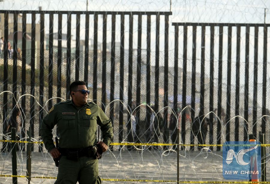 File Photo: A U.S. Border Patrol agent stands in front of the border fence that divides the U.S. and Mexico in San Diego, California, the United States, Nov. 17, 2018. (Xinhua/Zhao Hanrong)