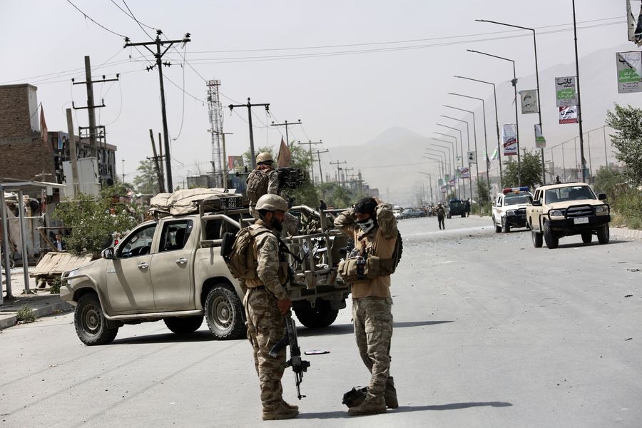 Members of Afghan security force stand guard near the site of an explosion in Kabul, capital of Afghanistan, on Aug. 7, 2019. (Xinhua/Rahmatullah Alizadah)