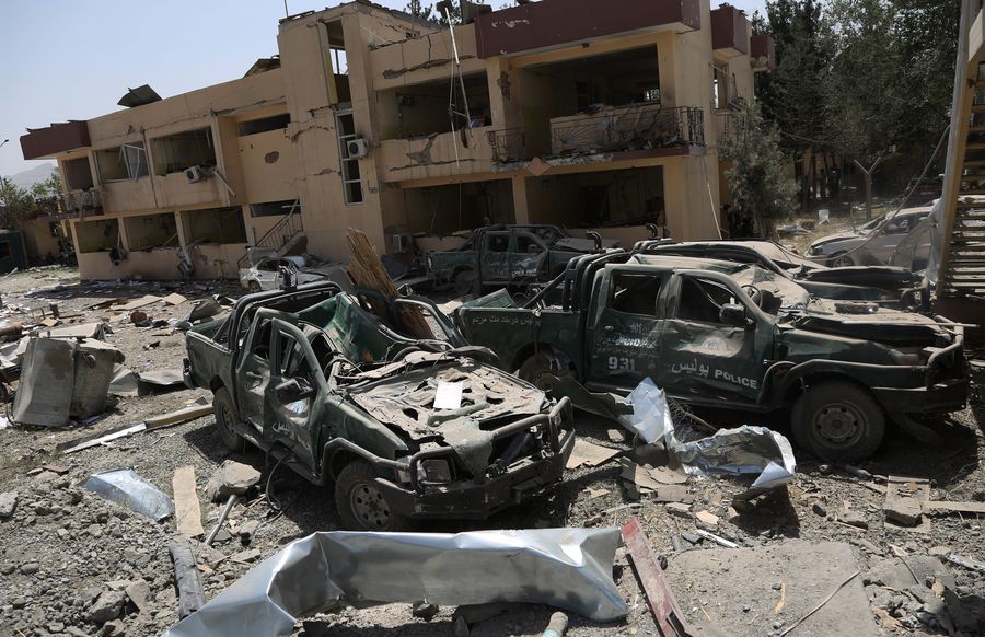 Afghan security force members inspect at the site of the explosion in Kabul, capital of Afghanistan, Aug. 7, 2019, when at least 95 people were wounded after a massive car bomb explosion. (Xinhua/Rahmatullah Alizadah)